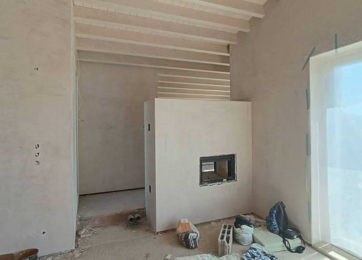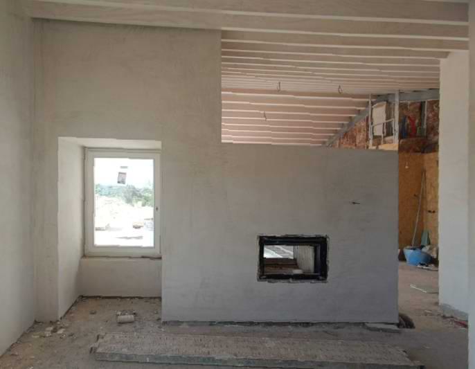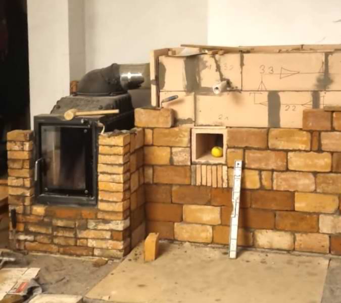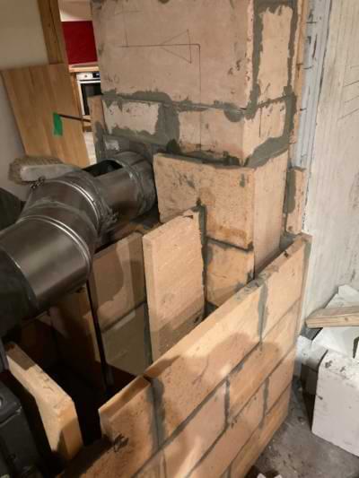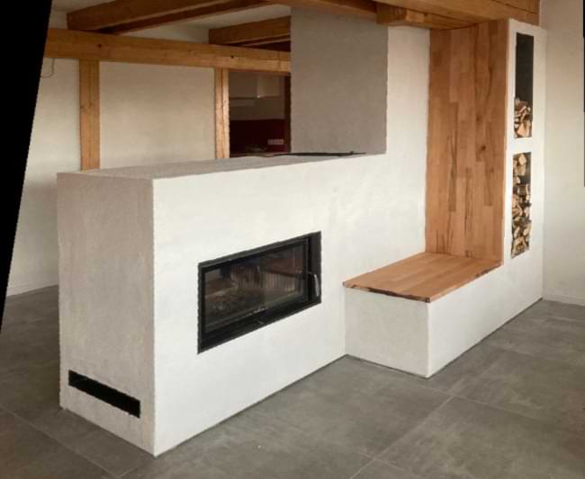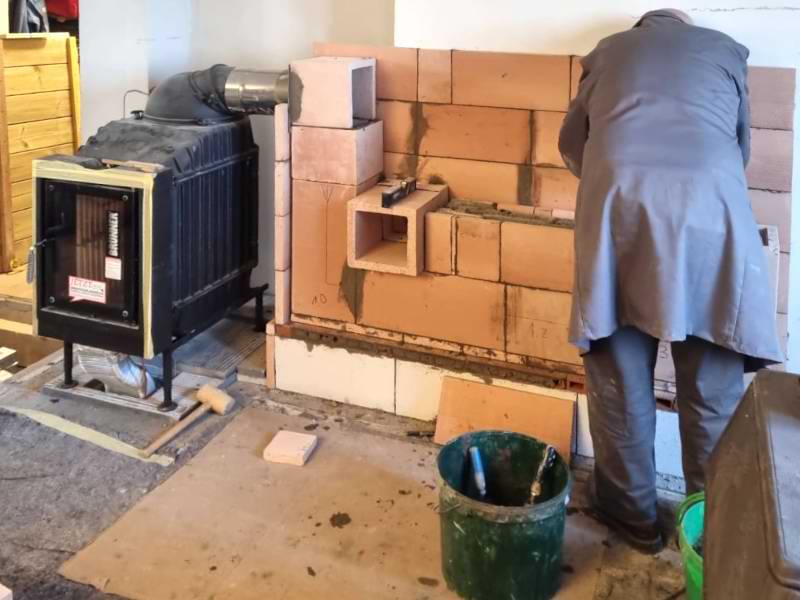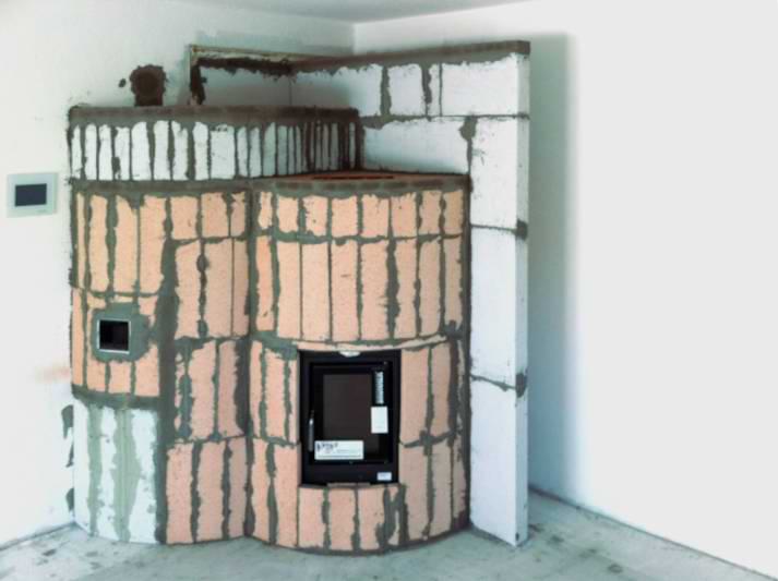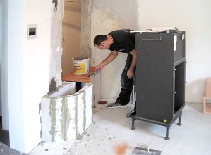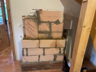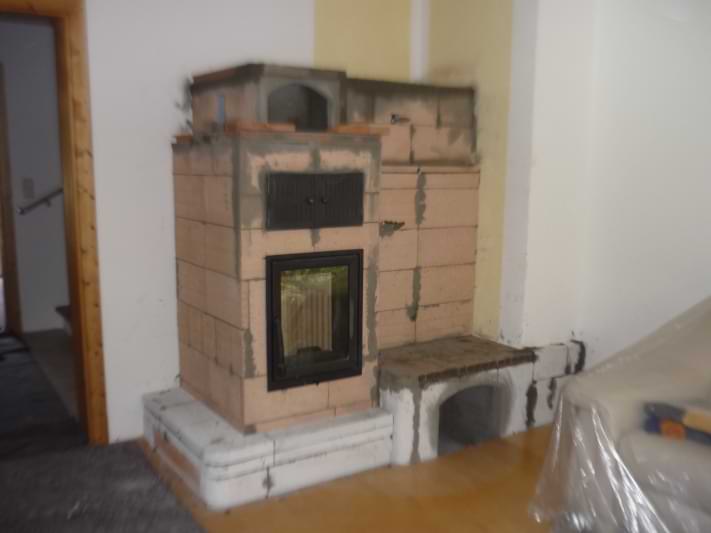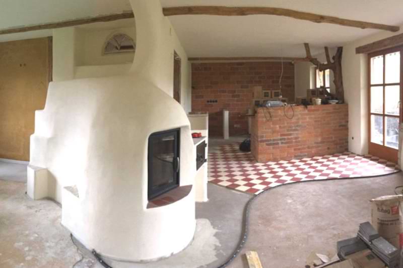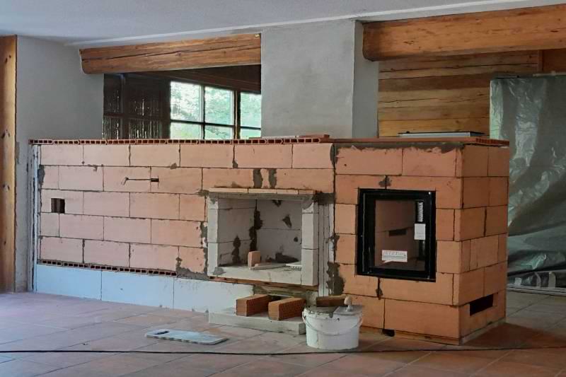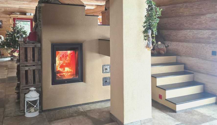 In einem Holzhaus sollte vor der Treppe ein schlichter Grundofen in L-Form gebaut werden mit Glasfenster und traditioneller Sitzbank.