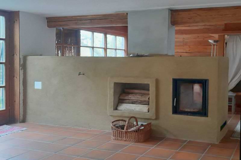 Schlichter Grundofen in L-Form, mit frei stehender Holzbank. Lehmputz.