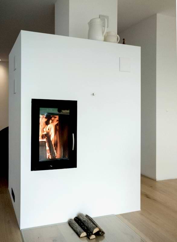 Wunsch der Bauherrin war, ein sogenanntes „Sitzfenster“ zu bekommen, eine breite Fensterbank, auf der man sitzen und lesen kann. Zugleich musste der Treppenlauf berücksichtigt werden. Wir haben einen Grundofen konzipiert, mit beheizter Bank. Die Heiztüre ist richtung Essplatz orientiert, der Rauchabzug senkrecht nach oben durchs Dach.