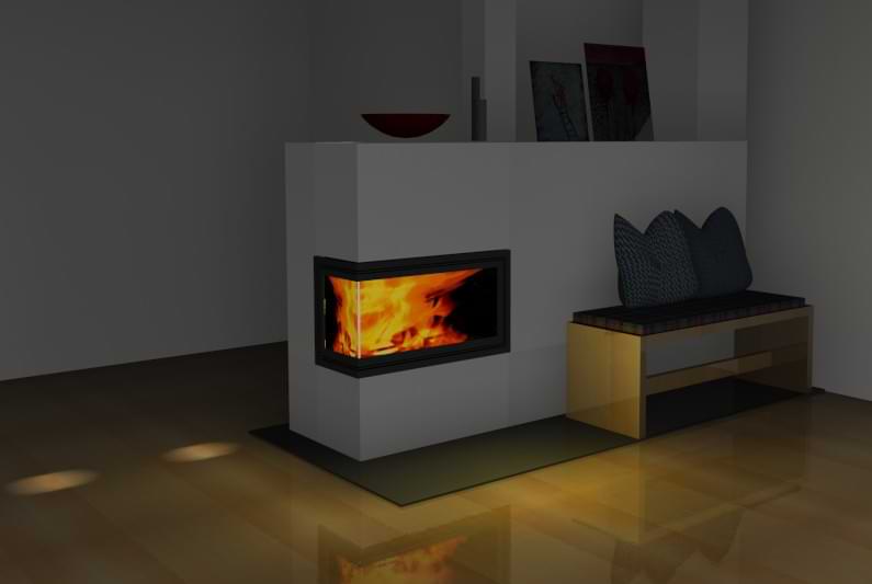 Grundofen als Raumteiler mit Eck Brennraum.